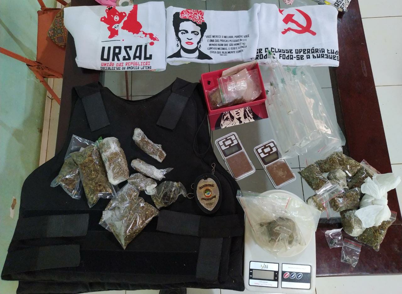 Em continuidade às diligências, Policiais da DEFURV encontraram ainda mais droga na residência de um dos autuados, da espécie “ecstasy” e maconha. Foi encontrado, ainda, um colete balístico e material típico de traficância, como balança de precisão e outros.