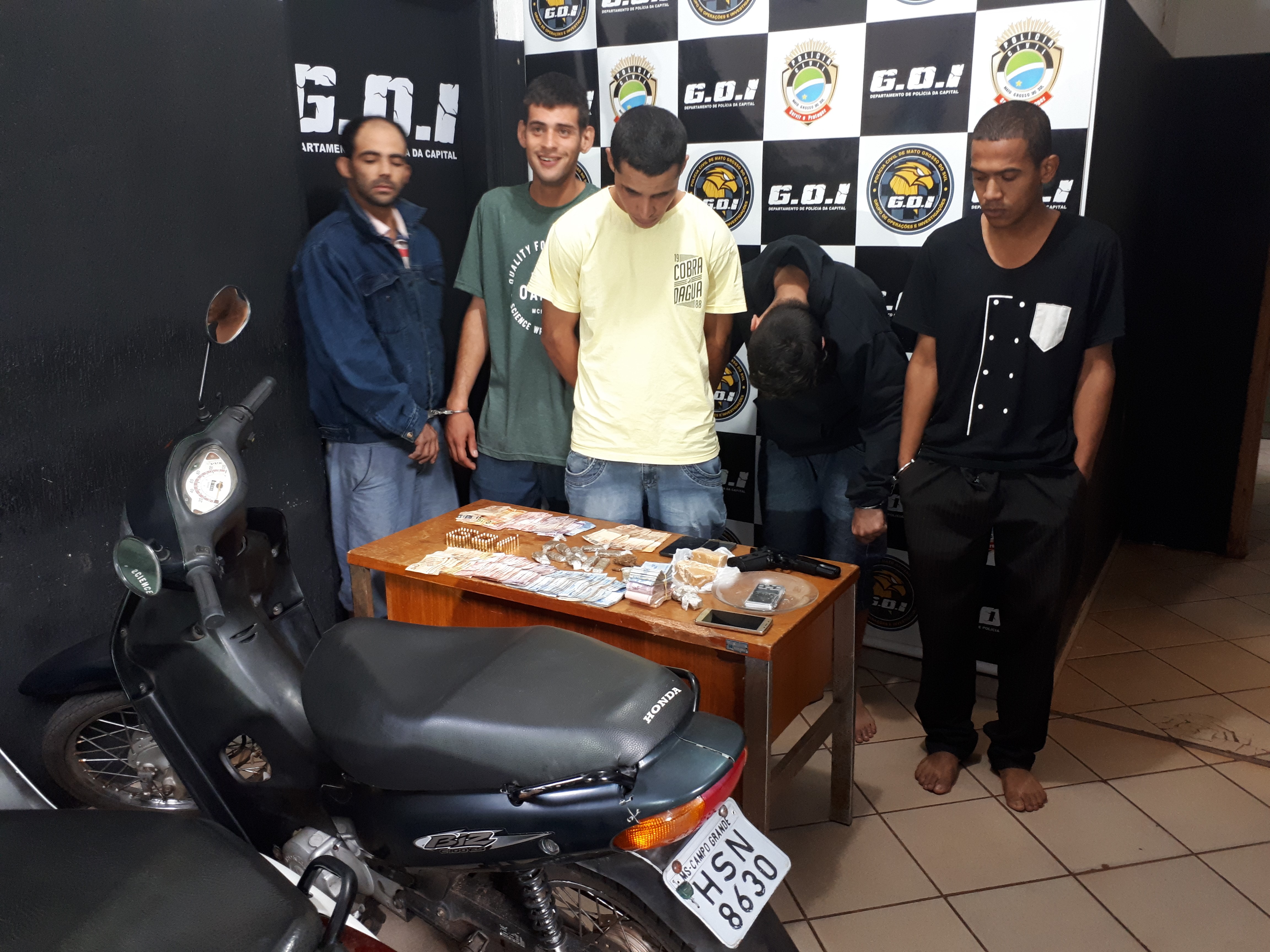 CAMPO GRANDE (MS): Na data de ontem (14), a Polícia Civil, através do Grupo de Operações e Investigações (GOI), deflagrou uma operação nos Bairros Jardim Nhanha e Amambaí, após vários levantamentos e monitoramentos realizados pelos policiais, resultando na prisão de VICTOR LEANDRO DA SILVA FERREIRA (21), VINICIUS EDUARDO CANTAO DA SILVA (21), PHELIPE MATHEUS DE OLIVEIRA RODRIGUES (23), ELIAS ALMEIDA DE OLIVEIRA (25) e JOEL LEANDRO JESUS AJALA DE ANDRADE (27).
