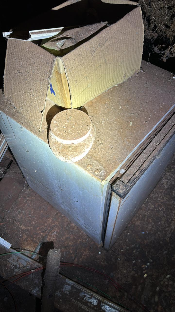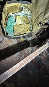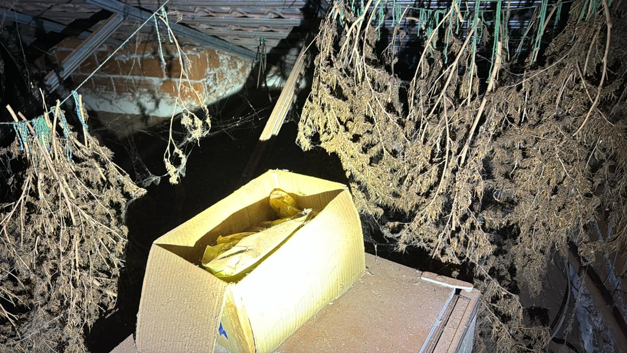 Durante as buscas na residência do investigado, foi encontrado dentro do forro da habitação, de forma totalmente oculta, um projetil de arma de fogo cal. 38 SPL, bem como, 10 tabletes de maconha, diversos galhos de planta com flores de maconha, farelos de maconha, uma ampola de 10ml de Cannabidiol e duas balanças de precisão.