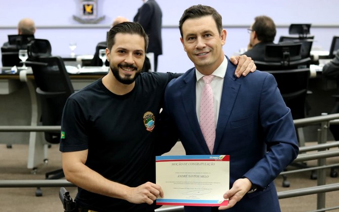 CAMPO GRANDE (MS) – Na manhã de hoje (18), ás 10h, na Câmara dos Vereadores de Campo Grande, o Policial Civil, André Santos Melo, recebeu do vereador André Salineiro uma Moção de Congratulação. A Moção de Congratulação foi entregue em