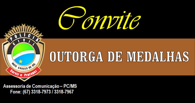 CAMPO GRANDE (MS): A Polícia Civil de Mato Grosso do Sul, convida a todos os policiais civis, para a Solenidade de Outorga, que acontecerá amanhã (05), às 09h, na Câmara dos vereadores de Campo Grande. Serão entregues 145 medalhas em homenagem