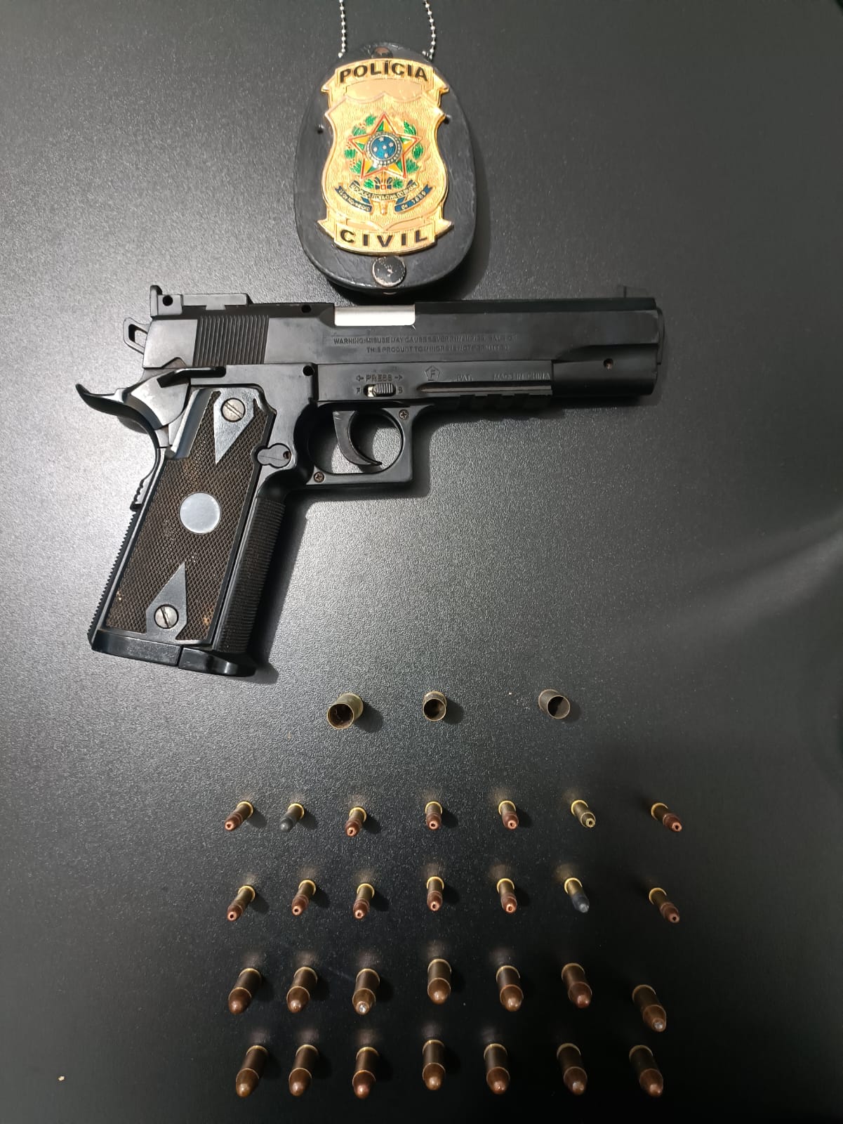 No imóvel do primeiro investigado foram localizadas dezenas de munições de diversos calibres, e uma réplica idêntica a uma arma de fogo tipo pistola, o autuado informou que havia se desfeito da arma que possuía anteriormente. Foram localizados ainda animais silvestres sem autorização, assim, o suspeito foi autuado em flagrante pelo crime de posse irregular de arma de fogo e crime ambiental.