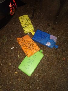 Os indivíduos abandonaram a moto e saíram correndo. Durante a fuga, foram arremessando tabletes de drogas que traziam consigo, dentro de uma mochila.