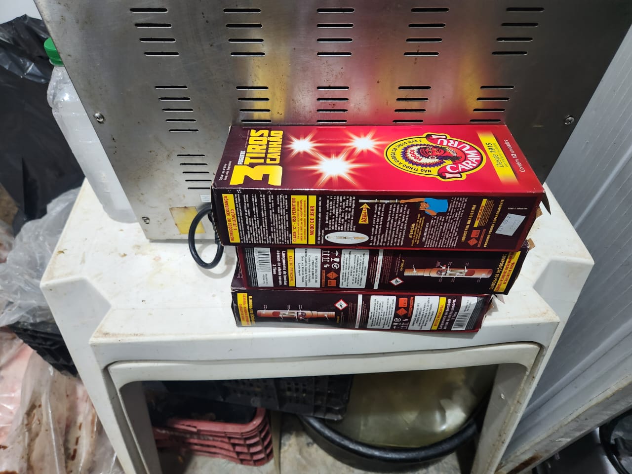 No local foram apreendidos 1.247,400kg de alimentos impróprios para o consumo. Também foram apreendidos fogos de artifícios e bebidas descaminhadas.
