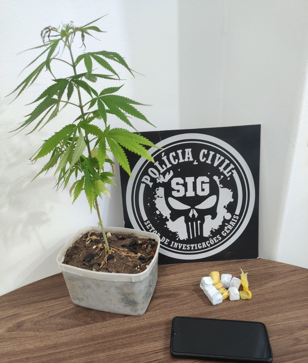 O recipiente foi encontrado pelos agentes e em seu interior foram localizadas diversas porções de maconha, já embaladas para a venda. Ainda nas vistorias no imóvel, os policiais encontraram uma muda do vegetal cannabis sativa, com o qual se produz a maconha.