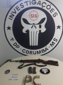 CORUMBÁ (MS): Policiais civis do Setor de Investigações Gerais (SIG), em conjunto com as Delegacias de Atendimento à Mulher (DAM) e de Atendimento a Infância, Juventude e Idoso (DAIJI) de Corumbá, realizaram diligência no intuito de confirmar a veracidade de informações recebidas sobre um armamento de calibre restrito que estaria em uma residência, localizada no bairro Guatos, parte alta da cidade.