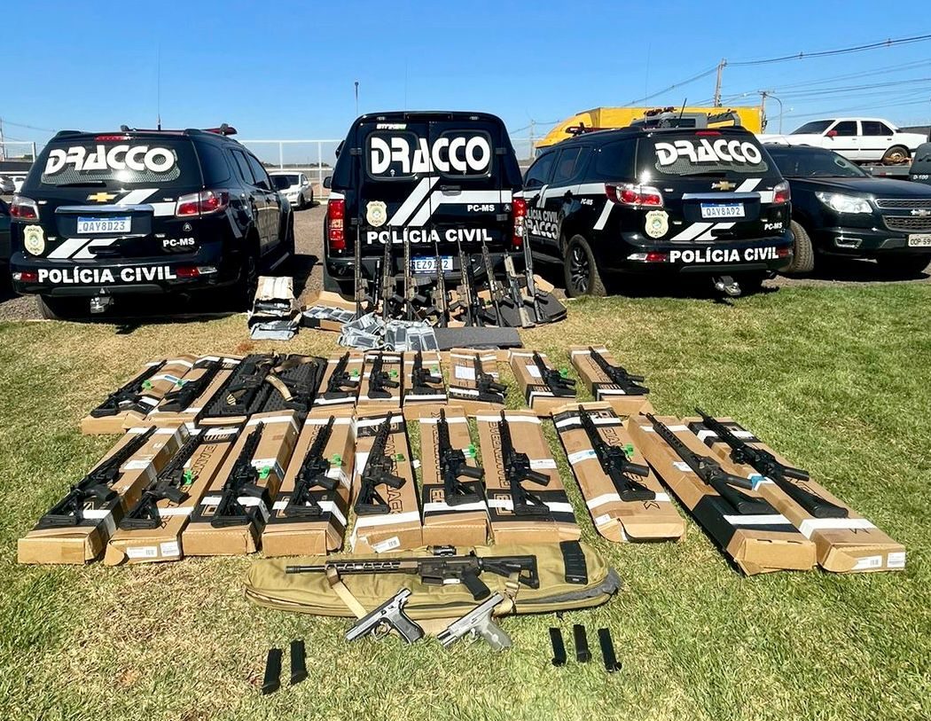 Na manhã desta terça-feira, 25/07, o DRACCO (Departamento de Repressão à Corrupção e ao Crime Organizado ), da Polícia Civil de Mato Grosso do Sul, desencadeou operação na faixa de fronteira em repressão ao comércio irregular de armas de fogo de uso restrito. Após o balanço e conferência dos objetos, foram apreendidos, no total: 28 fuzis 5,56 nato, 2 pistolas 9mm, 1SMT 9mm, 1 espingarda .357, 1 espingarda calibre 12 e diversos carregadores.