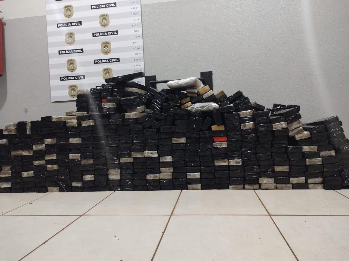 No imóvel em construção e inabitado os investigadores localizaram mais de 648 quilos, divididos em 768 tabletes de substância esverdeada análoga a maconha, petrechos para distribuição (papel filme, fita adesiva) e um caderno de controle da droga que era distribuída.