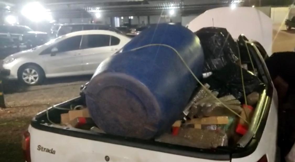 Além da droga que estava sendo transportada no Fiat Strada, os policiais apreenderam centenas de tabletes que estavam escondidos dentro de tambores. Três pessoas foram presas e autuados na sede do Garras pela prática de tráfico de drogas e associação para o tráfico.