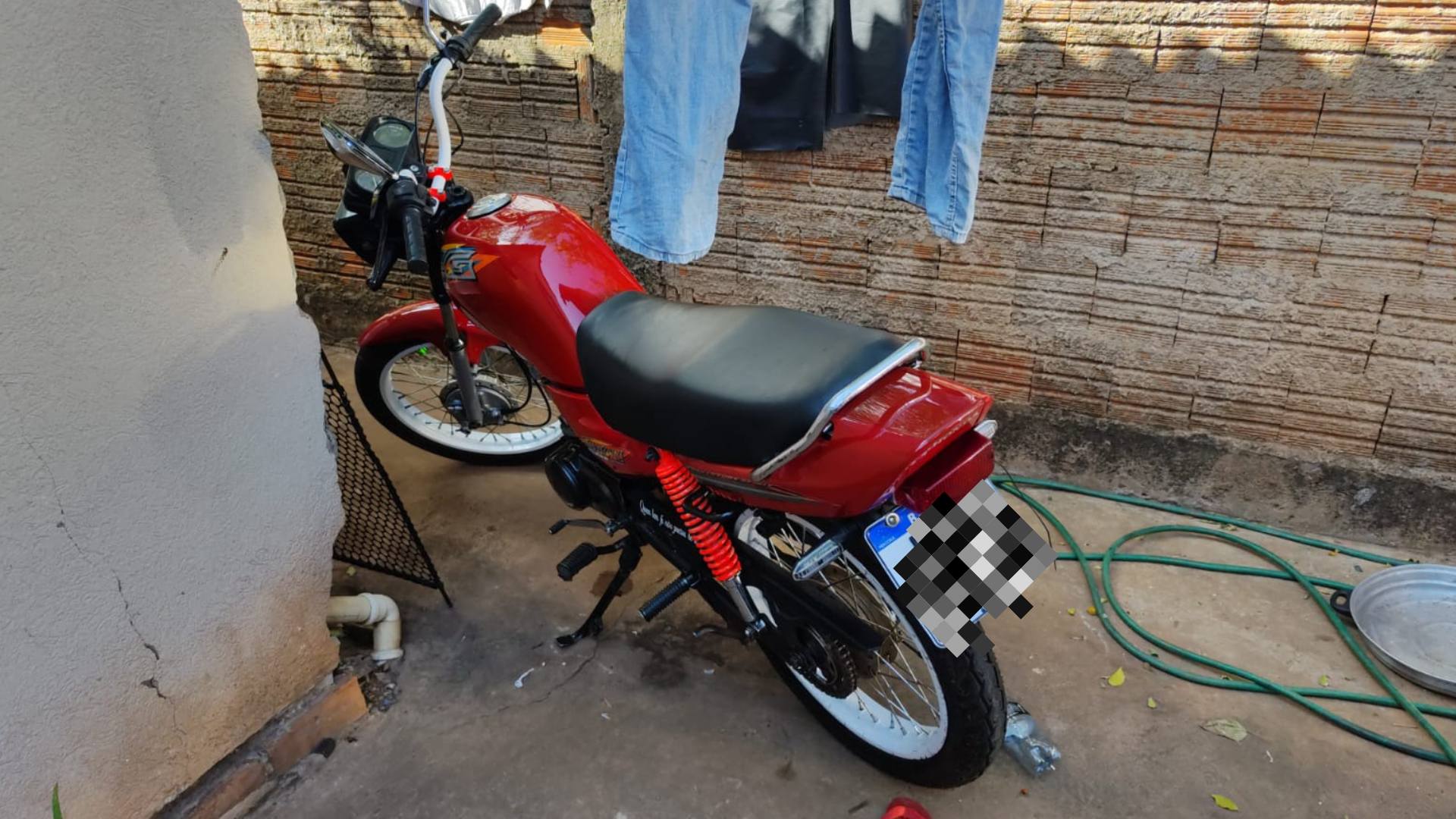 Ao serem atendidos por um adolescente, os policiais conseguiram visualizar no quintal da casa uma motocicleta com placa falsa. Após checarem o chassi, constataram que estava suprimido e sequer conseguiram ver qualquer numeração aparente.