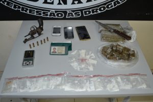 No guarda roupa do autor foi encontrado vinte e duas porções de maconha, pesando um quilo duzentos e quarenta e quatro gramas, além de uma arma de fogo, do tipo revolver, calibre .32, marca Taurus, municiado com seis cartuchos do mesmo calibre. Ainda dentro do guarda-roupas foram encontrados três invólucros de uma substância de ecstasy.