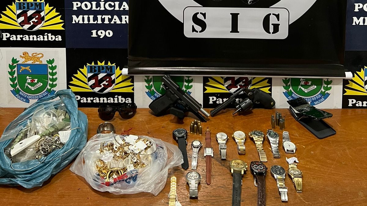 No local foram encontrados os objetos subtraídos, além de uma porção de maconha. Os dois homens portavam duas armas de fogo, sendo uma pistola .45 e um revólver .38, ambos municiados.