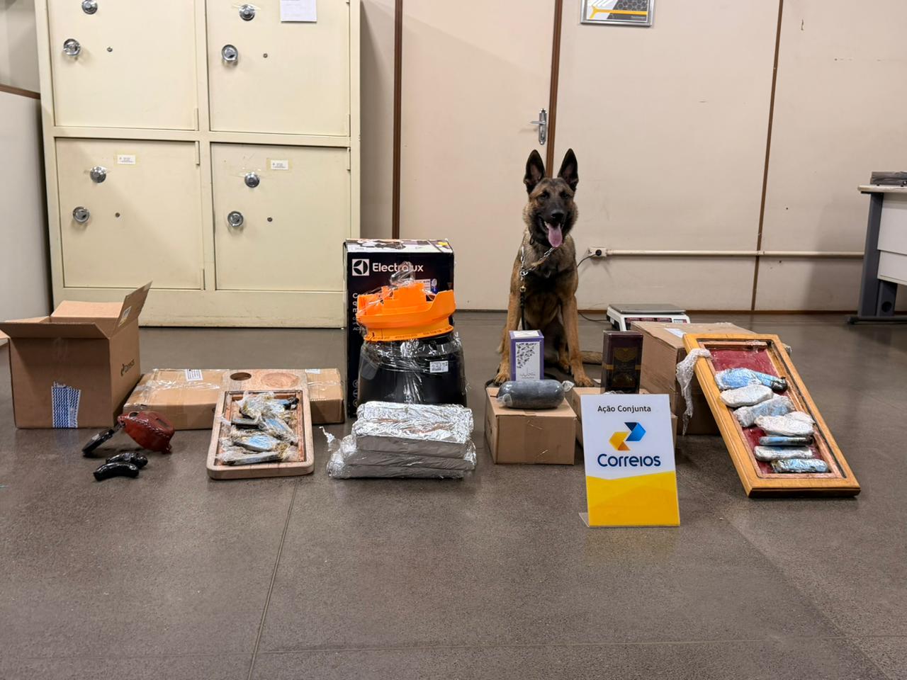 Durante as vistorias, o cão da raça Malinois (Pastor Belga) indicou positivamente seis embalagens despachadas nos Correios, que foram abertas e continham maconha prensada e haxixe marroquino.