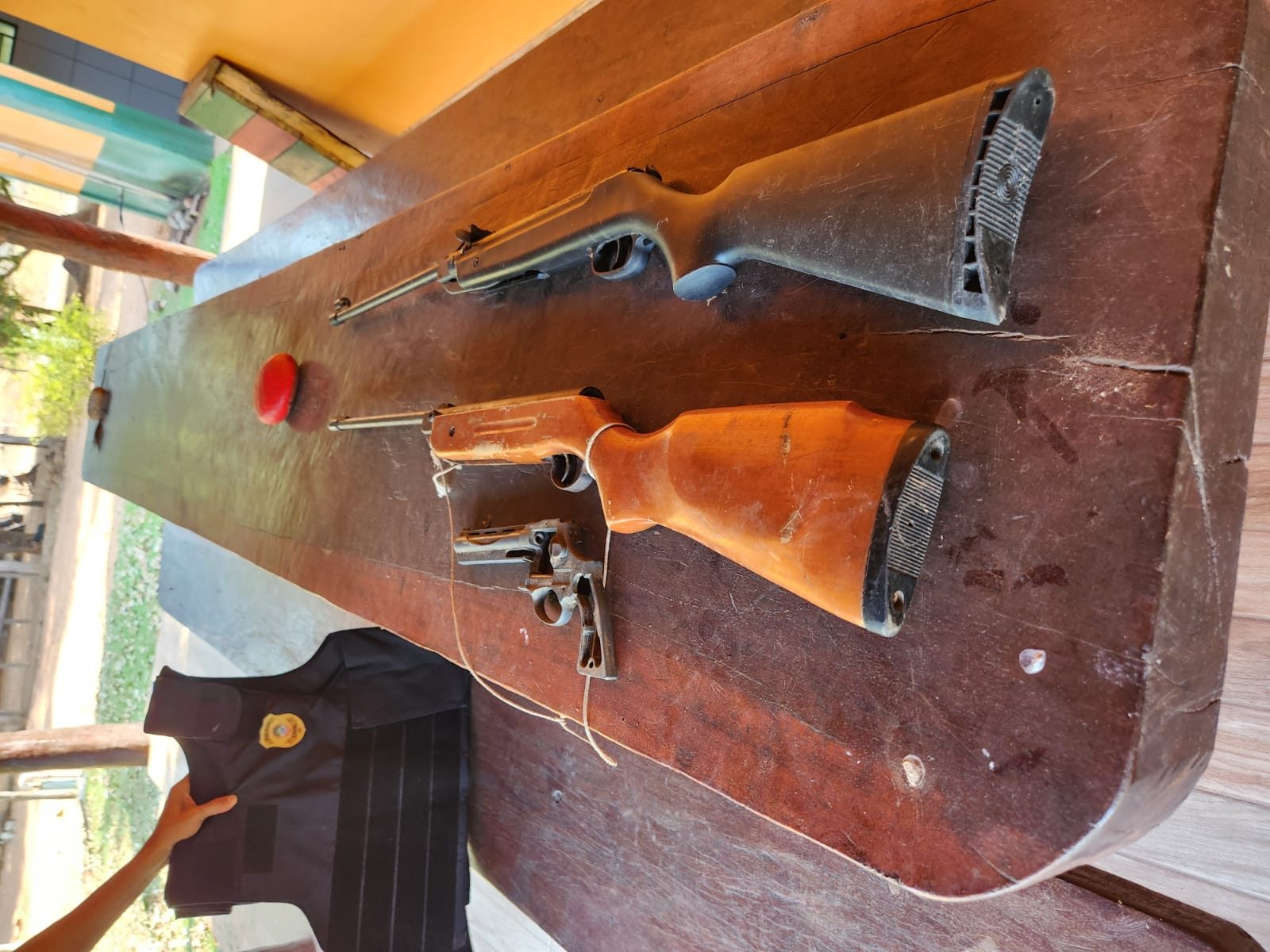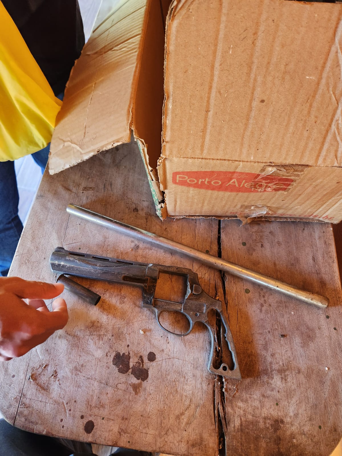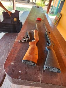 O mandado de busca e apreensão foi expedido após representação da Autoridade Policial considerando-se denúncia efetuada pela ex-convivente do suspeito. Durante as buscas, foram localizados: um revólver, calibre 22, desmontado, e duas espingardas. Ele, no entanto, não foi localizado.
