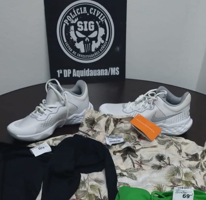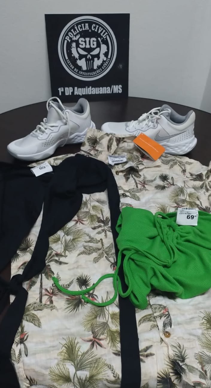 No local, foram encontradas diversas peças de vestuário, com etiquetas (inclusive com preços) de estabelecimentos comerciais da cidade de Campo Grande, as quais eventuais origens ilícitas serão apuradas pela 1ª Delegacia de Polícia de Aquidauana. A autora não foi encontrada no local, tendo a responsável pelo imóvel relatado que, após o cometimento do delito na cidade de Aquidauana, ela teria tomado rumo ignorado, estando em local incerto e não sabido.