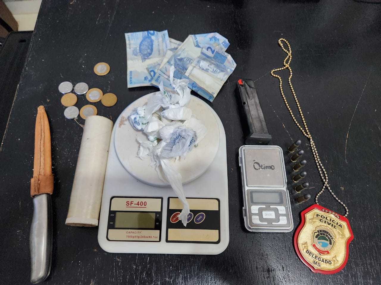 Durante as buscas no interior do imóvel, os policiais civis encontraram seis munições íntegras, de calibre .32, um carregador de pistola e uma sacola contendo 77g de cocaína. A substância estava fracionada e envolvida em embalagens plásticas, pronta para o comércio ilegal.
