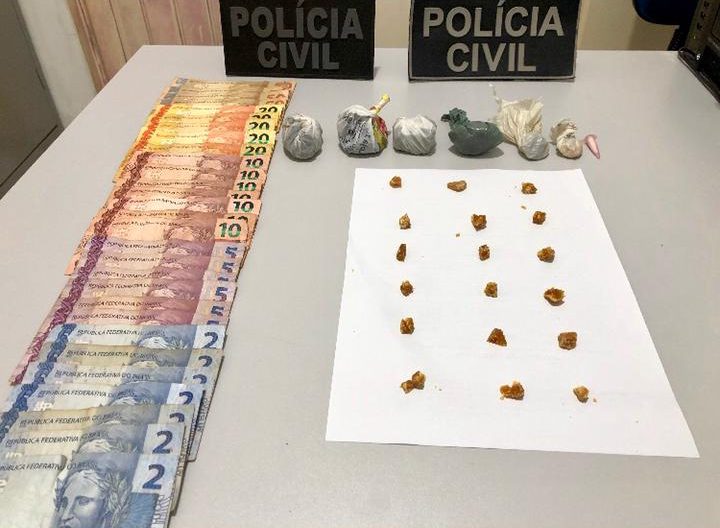Durante o cumprimento dos mandados, na residência do investigado foram localizadas drogas do tipo de maconha, crack e cocaína, sendo: quatro trouxinhas de maconha com 20 gramas cada, que totalizaram 80g, 32 pedras de crack, que totalizaram 11 gramas e um pino de cocaína que pesou uma grama, além de dinheiro proveniente do tráfico de drogas.
