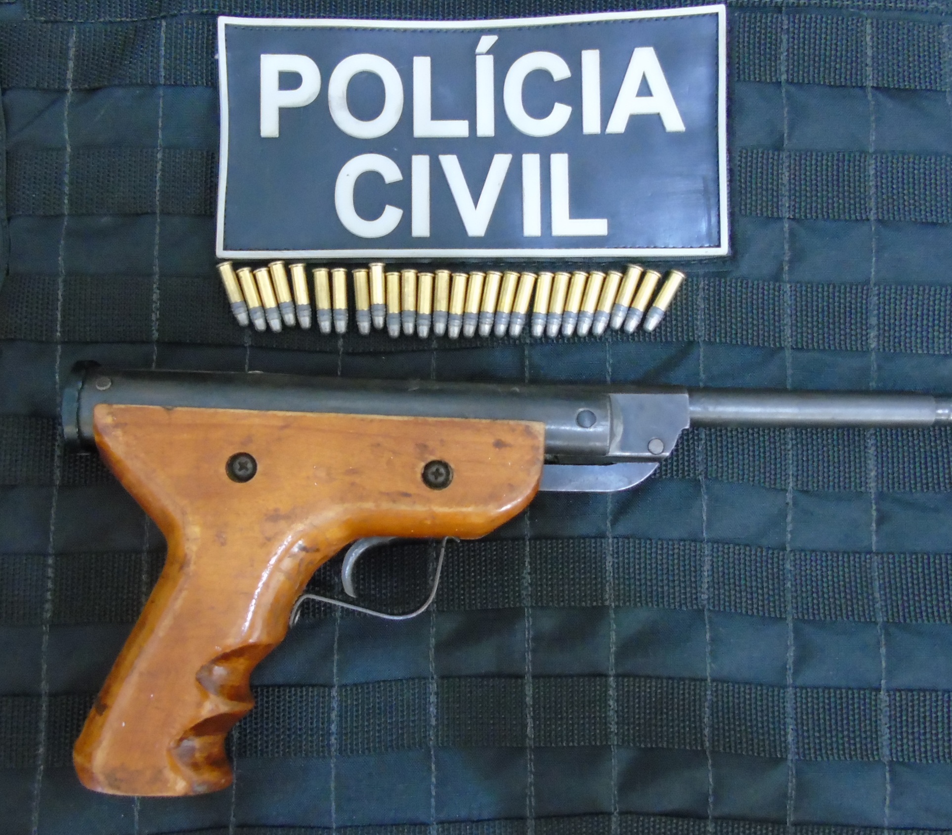 Durante sua prisão, os policiais realizaram buscas na residência e encontraram uma pistola de pressão adaptada para efetuar disparos de munições .22, bem como foram apreendidas 28 munições de mesmo calibre.