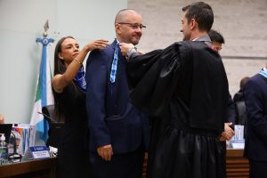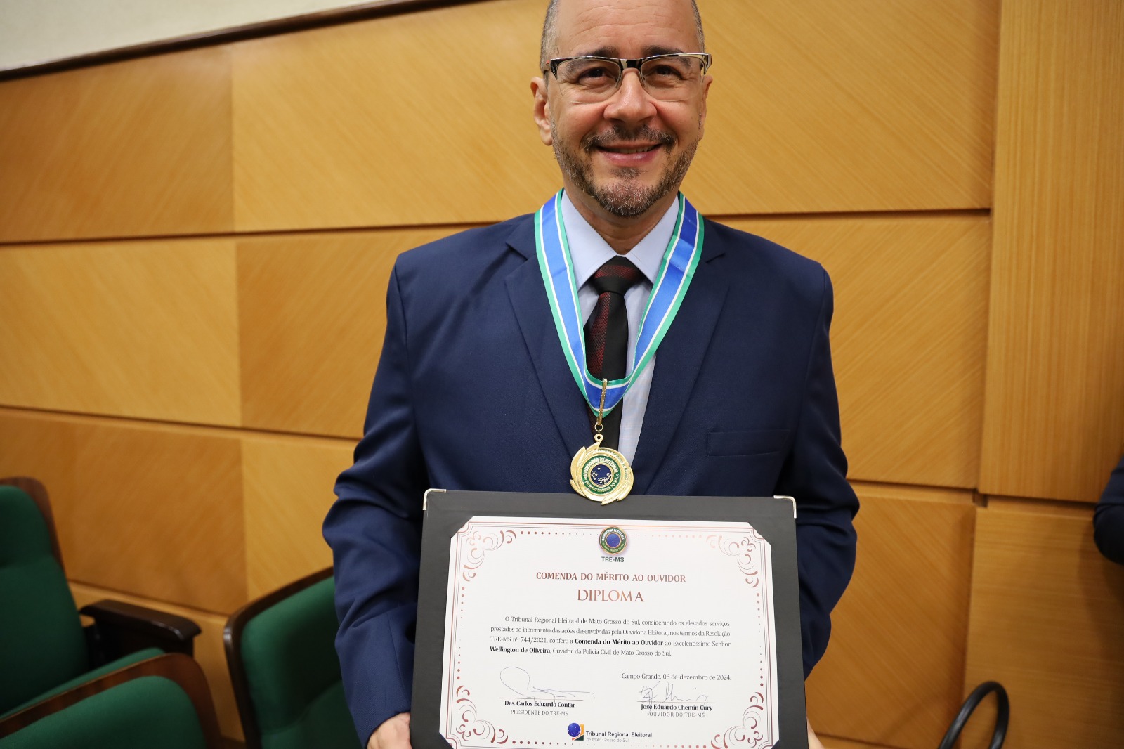 Na última sexta-feira (6), o delegado de polícia Wellington de Oliveira, Ouvidor da Polícia Civil de Mato Grosso do Sul, recebeu a honraria “Comenda do Mérito ao Ouvidor”. O prêmio, conferido pelo Tribunal Regional Eleitoral de Mato Grosso do Sul (TRE-MS), através do juiz eleitoral José Eduardo Chemy Cury, é especialmente significativo, pois Wellington foi o único Ouvidor agraciado que não pertence ao judiciário.