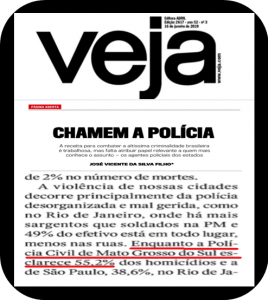 CAMPO GRANDE (MS) – A Polícia Civil ganhou destaque na Edição 2617, da Revista Veja, ano 52, nr. 3, na reportagem de Jose Vicente da Silva Filho, denominada “Chamem a Polícia”. A Polícia de Mato Grosso do Sul é citada como sendo a que mais esclarece homicídios no Brasil com uma taxa de 55,2 % de elucidação, seguida pela de São Paulo, 38,6%. Já no Rio de Janeiro esse número limita-se a 11,8%.