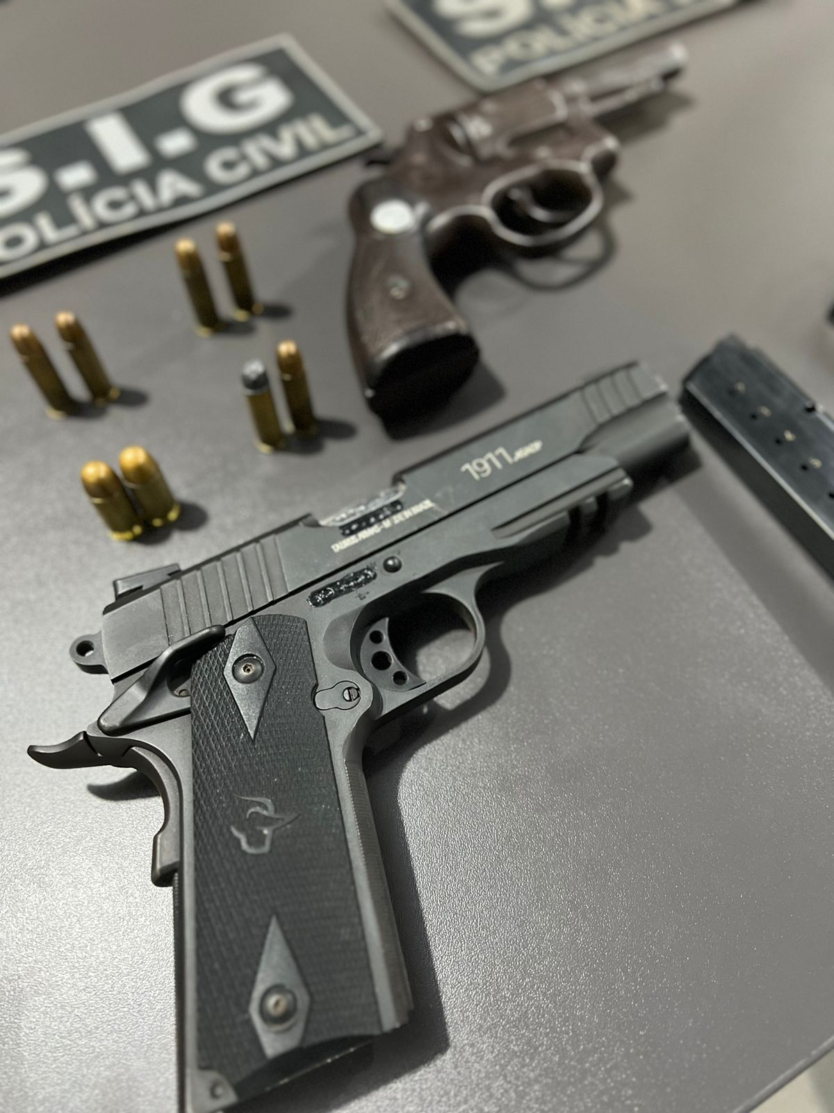 Nesta segunda feira, 18/12, durante o cumprimento da ordem judicial, agentes da SIG apreenderam com o indivíduo, duas armas de fogo, sendo um revólver, calibre .38 e uma pistola, calibre. 45. Além disso, outras provas cautelares foram reunidas, as quais confirmaram o comércio ilegal de arma de fogo por parte do suspeito, vindo ao encontro das investigações pretéritas (armas de fogo chegaram a ser colocadas à venda pelo suspeito pelo valor de R$ 7 mil).