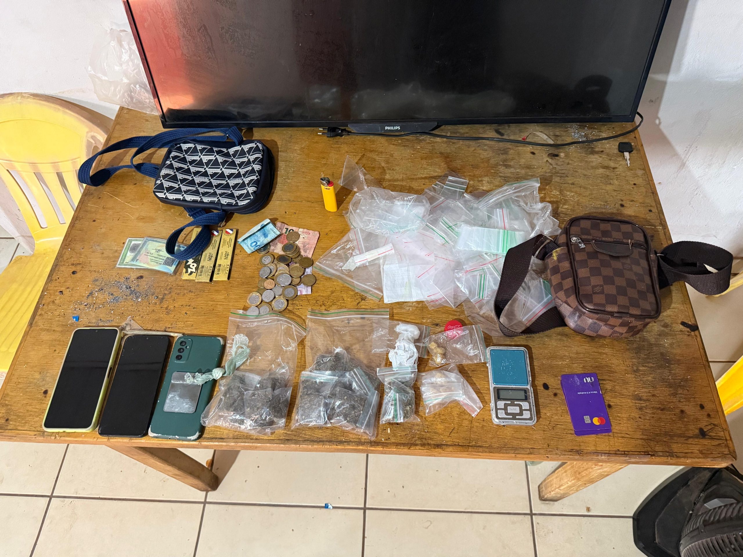 Durante o cumprimento de mandado de busca e apreensão em um imóvel no bairro Boa Vista, os policiais apreenderam drogas, dinheiro, uma balança de precisão e diversos invólucros utilizados na preparação e comercialização de entorpecentes. No local, um jovem de 18 anos foi preso em flagrante por tráfico de drogas, enquanto um usuário foi encaminhado para prestar esclarecimentos.