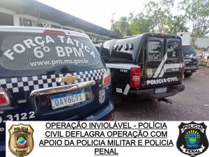 A Polícia Civil, com apoio das Polícias Penal e Militar, deflagrou nesta terça-feira, 16/01, em Corumbá-MS, a operação “Inviolável”, cumprindo cinco mandados de prisão, uma de internação provisória de adolescente infrator e seis mandados de busca e apreensão. Além disso, durantes as buscas, foram presas duas pessoas em flagrante pelos crimes de tráfico de drogas e receptação.