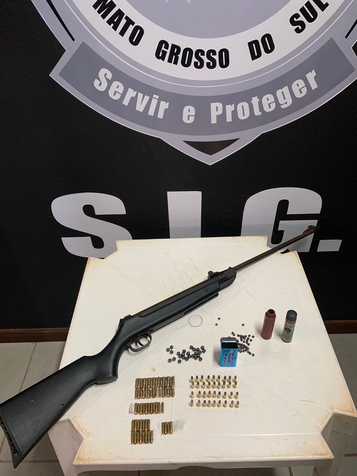 Foi encaminhada pela autoridade policial e deferida pelo poder judiciário representação pela busca e apreensão em 4 endereços ligados ao suspeito, sendo uma residência, um sítio, um bar e uma oficina. No sítio foi encontrada a arma de fogo – uma espingarda calibre .22 -, 97 munições do mesmo calibre, diversos balotes utilizados como munição para outra espingarda, e pólvora.