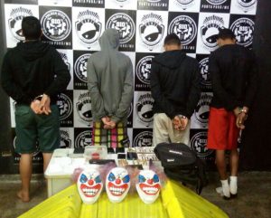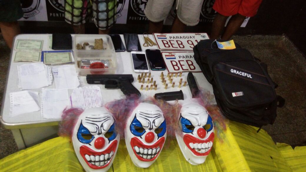 Foi apreendido na residência três “máscaras de palhaço”, quatro mochilas “de tiracolo” novas e idênticas e duas placas de veículos paraguaios, elementos indicativos de que os flagrados planejavam a prática de um roubo de grande vulto.