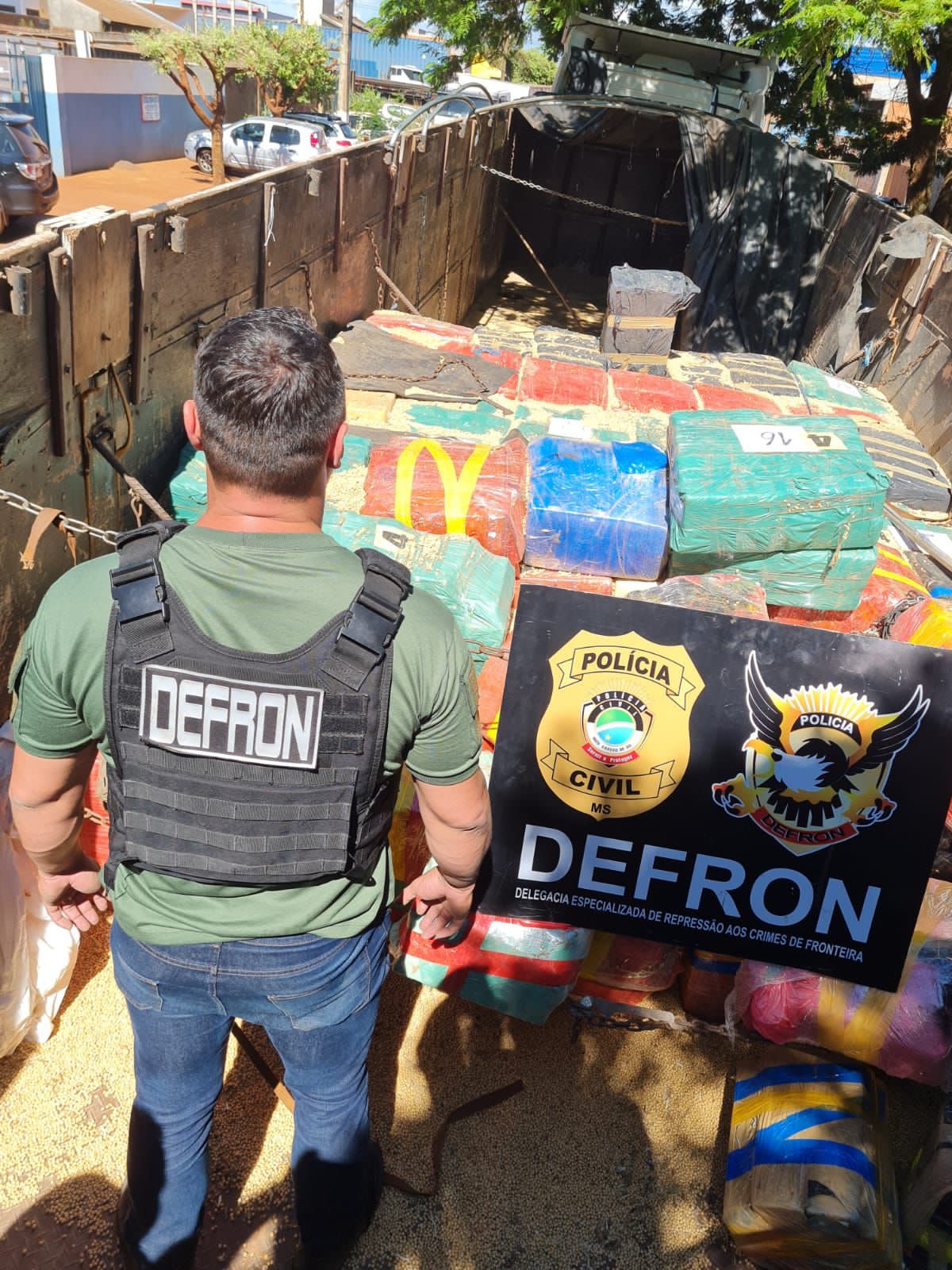 Na manhã de hoje, em uma estrada localizada no município de Eldorado, a Defron interceptou uma carreta que teria como destino uma cidade gaúcha. A droga encontrava-se encoberta por grãos de soja, visando dificultar a sua identificação.