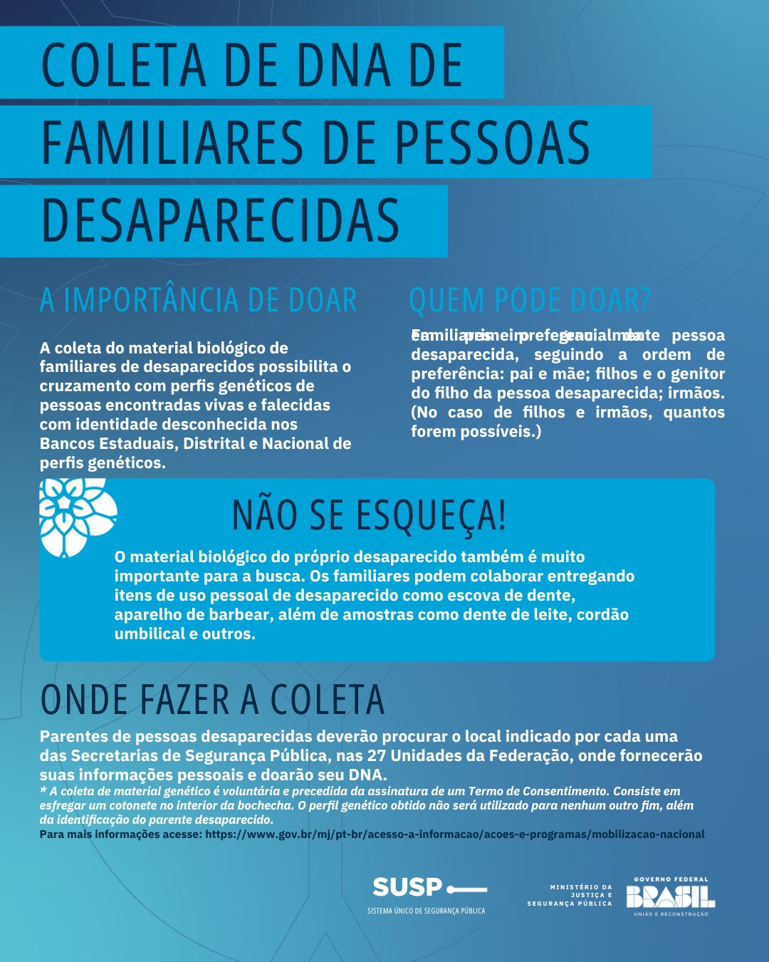 Segundo informou o delegado Carlos Delano, que atua como Autoridade Central Estadual da Política Nacional de Busca de Pessoas desaparecidas, a campanha nacional será dividida em três etapas, a primeira etapa será realizada de 26 a 30 de agosto e consiste na coleta de DNA de familiares de desaparecidos em unidades de perícia. A segunda etapa, prevista para setembro de 2024, haverá coleta de DNA e impressões digitais de pessoas vivas não identificadas, a terceira etapa acontecerá em outubro e estará voltada à coleta, para inserção em banco nacional, de DNA e impressões digitais dos Institutos Médicos Legais.