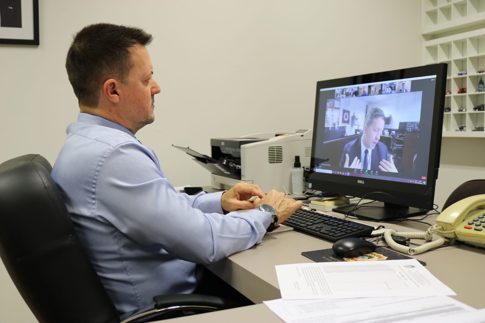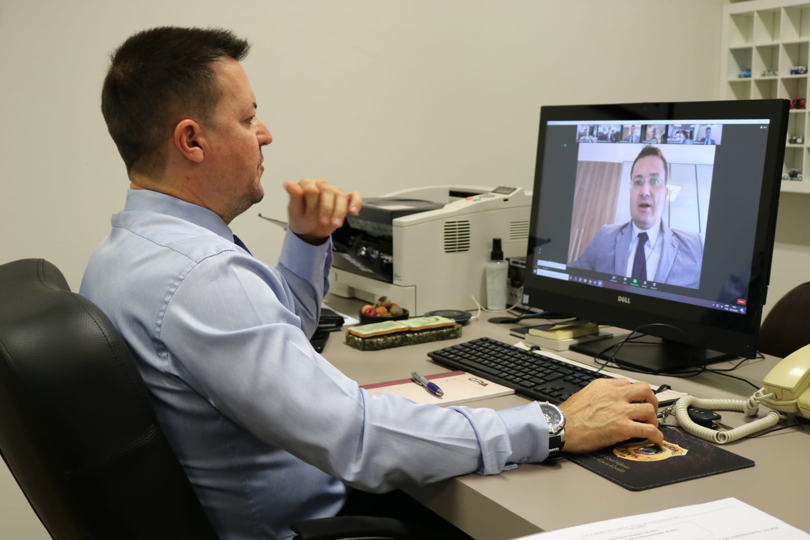 O Delegado-Geral da Polícia Civil, Adriano Garcia Geraldo, participou, nesta quarta-feira, 06/10, de uma videoconferência com a comandante da região 2 do OSI (Escritório de Investigações Especiais da Força Aérea dos Estados Unidos) – coronel Tara Lunardi, o diretor de OL-B da OSI – agente especial Lynn Stedge, adido policial do escritório de segurança das forças armadas dos Estados Unidos – David Sorensen e investigadores locais do FPD – Jean Paraski e Matheus Lins.