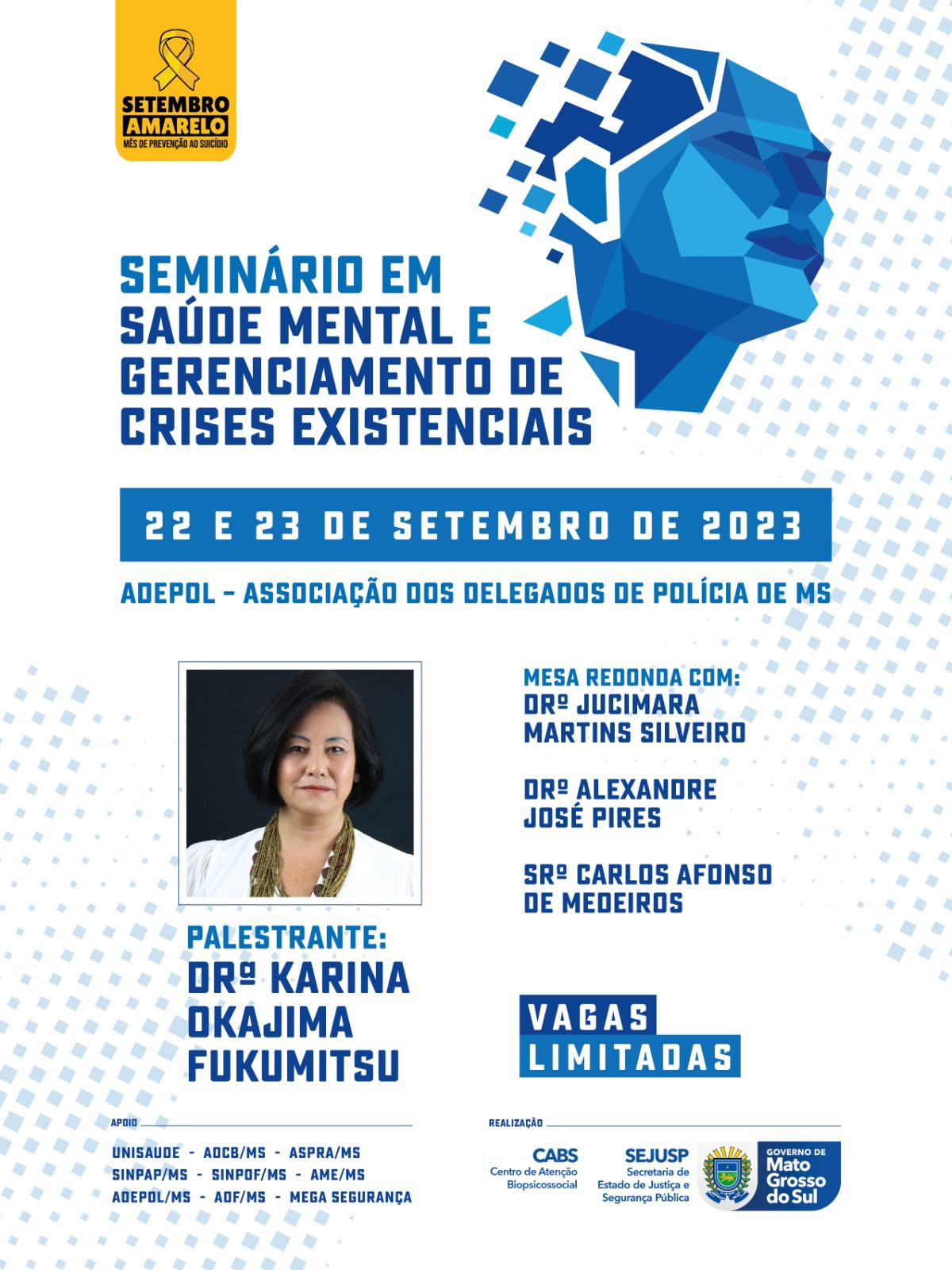 Neste mês de setembro, em alusão à campanha “Setembro Amarelo”, que é dedicado à prevenção do suicídio, a Polícia Civil e a Secretaria de Justiça e Segurança Pública (Sejusp) vão realizaar o seminário de saúde mental e de gerenciamento de crises existenciais. O evento acontecerá, na Associação dos Delegados de Polícia do Mato Grosso do Sul (ADEPOL/MS), nos dias 22 e 23 e será coordenado pela Coordenadoria de Atendimento Psicossocial e Espiritual (CAPE) e pelo Centro de Atenção Biopsicossocial (CABS).