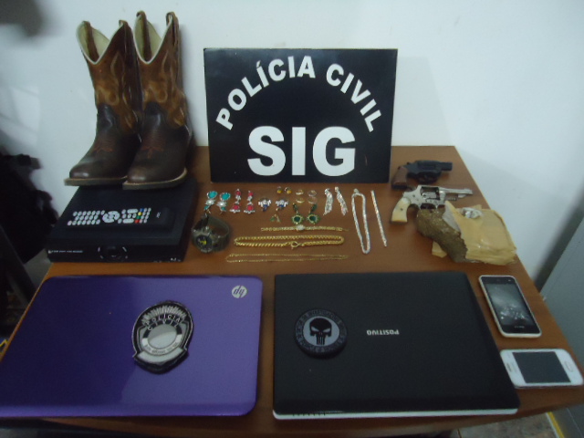 Foi apreendido um notebook, gravador de imagem para circuito fechado, furtados de um comércio,  um aparelho televisor de 48 polegadas, roteador, diversas jóias e semi-jóias, notebook, par de botas, furtados de uma residência,  uma bateria de 12volts, extensão de energia, furtados de uma loja comercial,  a Polícia Civil já identificou as respectivas vítimas.dsc06267