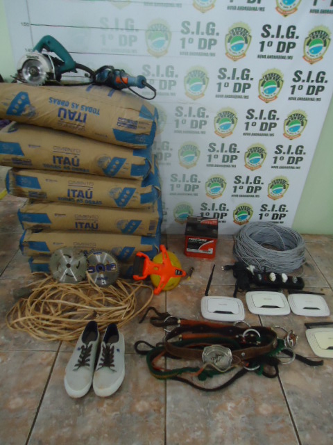 Além dos objetos localizados na residência, os Policiais da SIG diligenciaram na cidade como também no Distrito de Nova Casa Verde onde lograram êxito em localizar uma maquita, dois discos, extensão de energia elétrica, trena, seis sacos de cimento, furtados de uma obra da construção civil.dsc06260