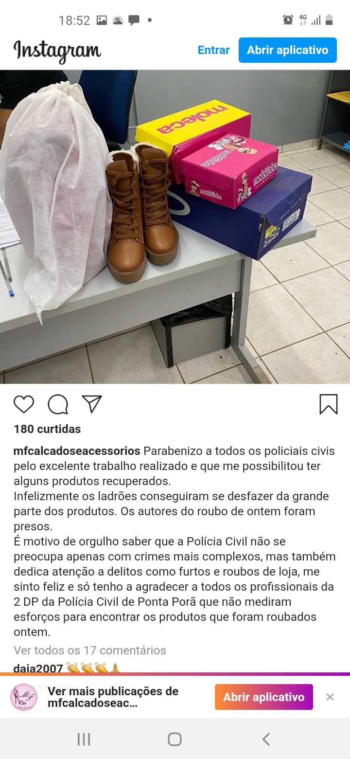 Ato contínuo, a equipe da Policia Civil passou a realizar diligências visando localizar os bens furtados. Parte dos calçados e bolsas foram recuperados, sendo encontrados na residência de um casal que foi conduzido para a Delegacia e indiciados pelo crime de receptação dolosa. Outra parte dos produtos foram entregues espontaneamente à equipe policial.
