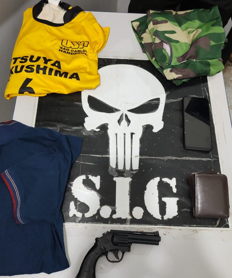 Em relação à suposta arma de fogo, na verdade, os autores estavam portando um simulacro, que foi apreendido. No local, também, foram apreendidas as camisetas que eles utilizaram para praticar o crime, reconhecidas pela vítima.