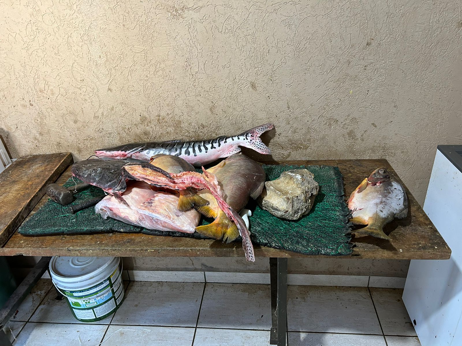 Na residência do proprietário do referido restaurante foram apreendidos 65,08 kg de pescados com sinais de captura por meio de petrechos de malha (rede e tarrafa) e 01 rede de pesca, além da aplicação de multa pecuniária administrativa no valor de R$ 4.000,00. Na residência de A.A.S. foram apreendidos diversos petrechos utilizados para a captura ilícita de pescados, como por exemplo, anzóis de galho sem plaqueta de identificação, tarrafas e redes de pesca além de 02 porções de substância análoga à maconha e 06 bitucas de cigarro feito com substância análoga à maconha, sendo que o mesmo foi encaminhado para a 1ª Delegacia de Polícia de Aquidauana para a adoção das providências cabíveis.