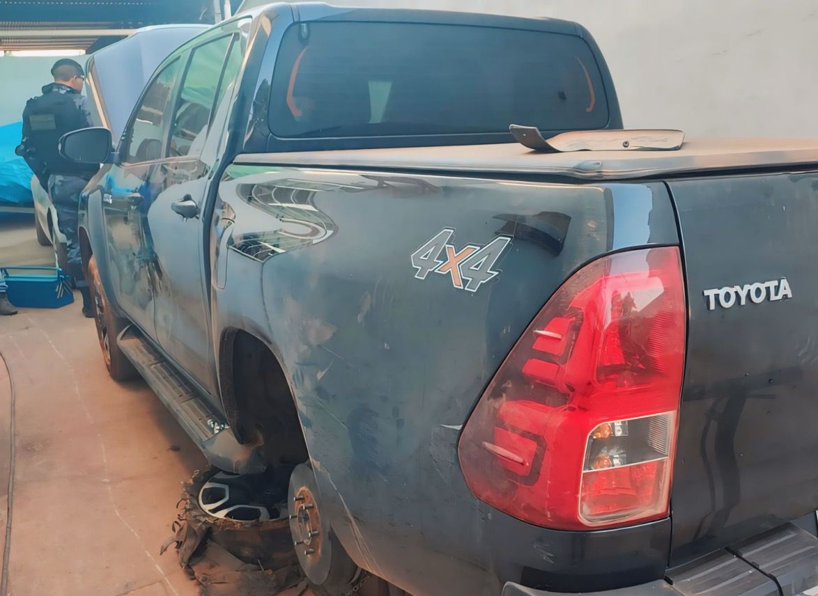 A Polícia Civil por intermédio da 1ª Delegacia de Polícia de Dourados em ação integrada com 17º BPM de Mirassol D’Oeste, FT, Gefron, do Mato Grosso, localizou e apreendeu um veículo tipo HILUX, Diesel, Cor Preta, ano 2022, que se encontrava numa oficina mecânica na cidade de Mirassol D’Oeste, no Estado do Mato Grosso, sendo produto de crime. Os criminosos alteraram os sinais identificadores inserindo uma placa de outro veículo do mesmo modelo que se encontrava na cidade de Dourados.