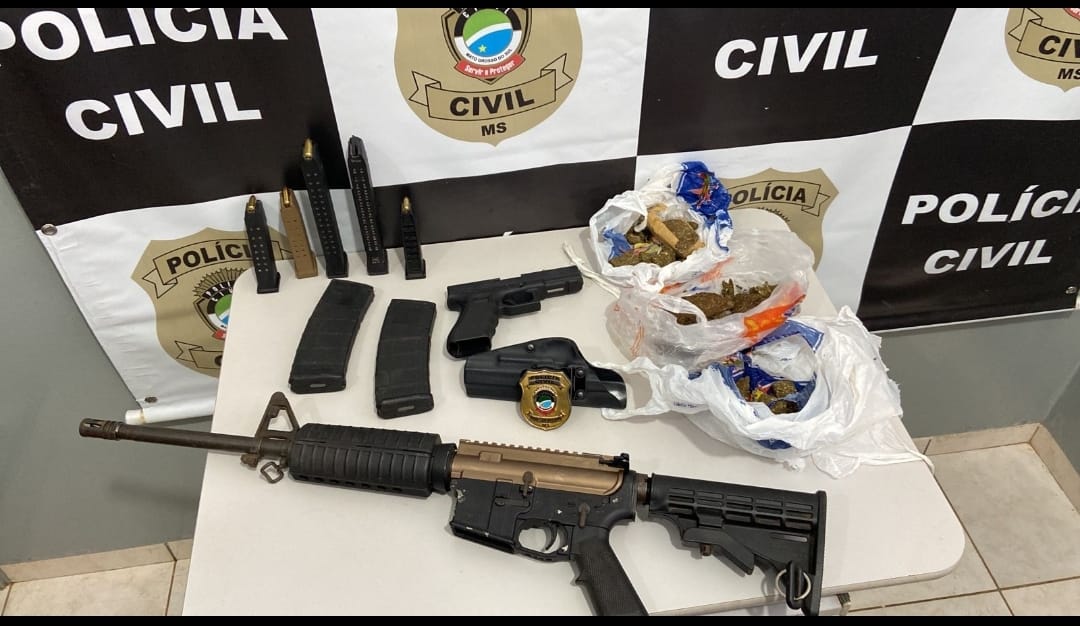 A Polícia Civil de Ponta Porã cumpriu mandado de prisão e mandados de busca e apreensão contra autor de tentativa de homicídio, aprendendo em sua residência fuzil, pistola e droga.