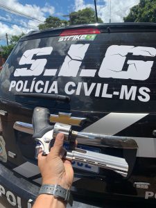 Os policiais civis então realizaram busccas ao longo da madrugada, e no período da manhã de ontem e conseguiram localizar o veículo relacionado aos fatos e o condutor, L.V.S.B., 22 anos. Durante revista no veículo foi encontrado um revólver da marca Taurus, cromado, calibre 38, com capacidade para 8 tiros com 4 munições intactas.