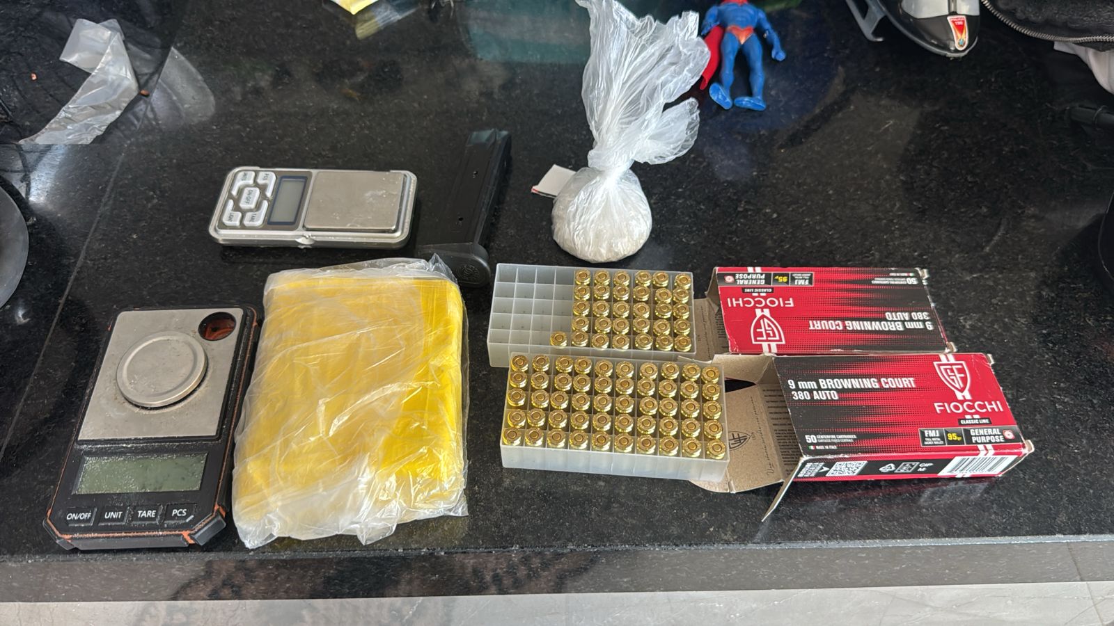 Durante as diligências para localizar os suspeitos, a equipe policial se deslocou até o endereço do investigado de 28 anos, no bairro Vival dos Ipês. No interior da residência foram localizadas 81 munições calibre .380, um carregador de pistola, além de aproximadamente 387 gramas de substância análoga à cocaína, balanças de precisão e materiais utilizados para embalo de entorpecentes.