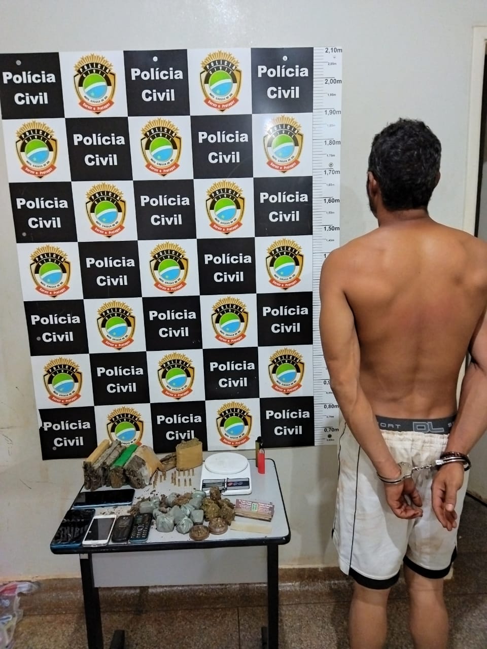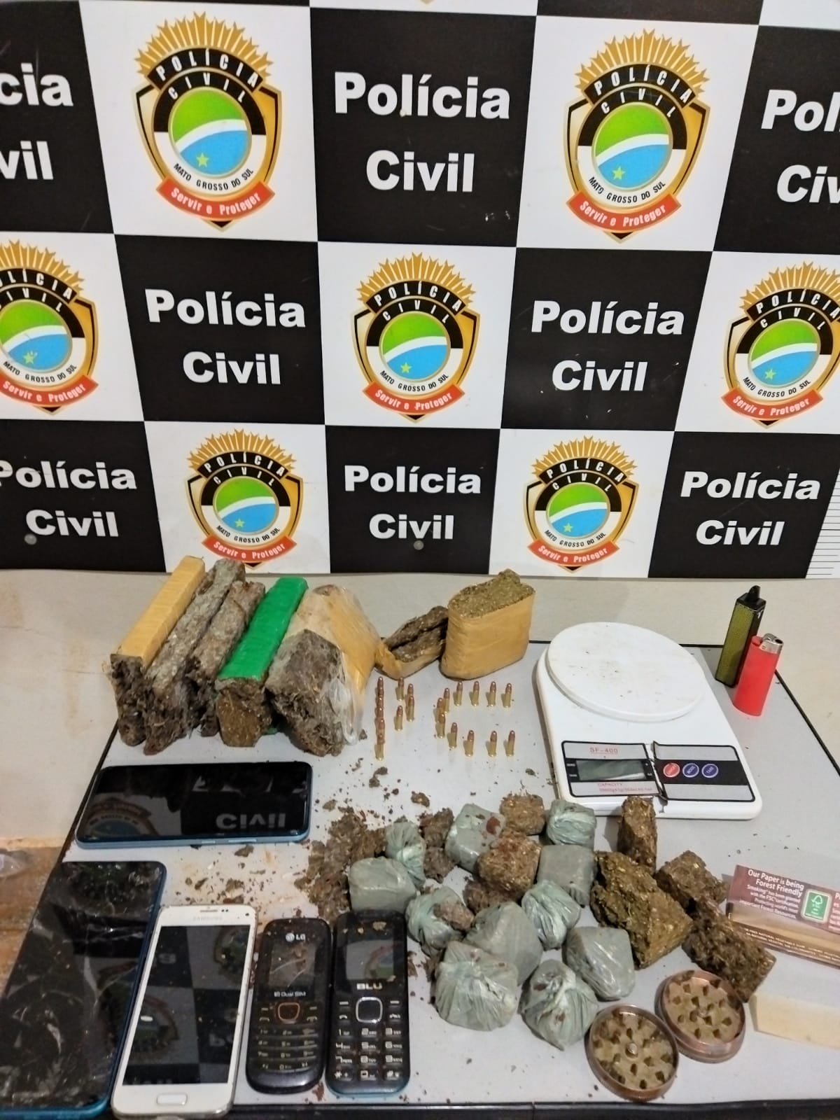 Com o indivíduo, foram apreendidos celulares, balança de precisão, 21 munições de calibre .22, além de 2.400 kg de maconha prontas para comercialização.