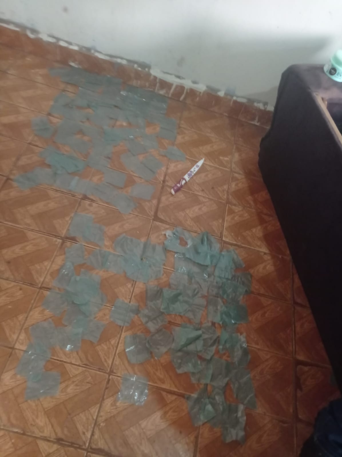 Logo que os policiais entraram, já visualizaram no chão diversos círculos de plástico – usualmente utilizados para embalar entorpecente. Ao ser indagado, K.H.S.M. mencionou que alugava a casa há um tempo atrás e tinha passado ali para pegar papéis do cumprimento de pena em regime aberto, negando a existência de drogas, bem como negou ter furtado a motocicleta.