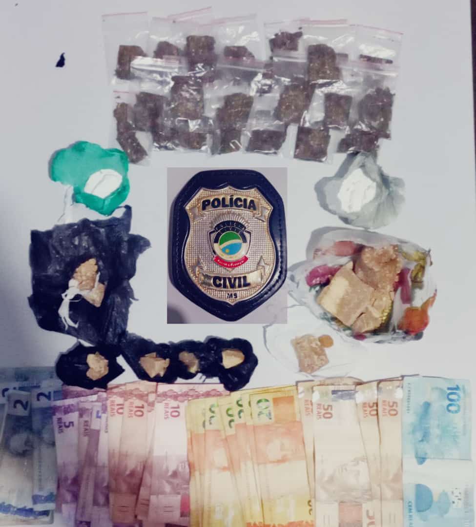 De imediato a Polícia Civil iniciou trabalho investigativo e encontrou no imóvel mencionado, 01 pedra de pasta base de cocaína, pesando 141 g, 03 porções de cocaína pesando 40 g e 23 porções de maconha pesando 96 g e R$ 648,00, em notas trocadas, 01 balança de precisão, além de outros objetos relacionados à conduta criminosa.