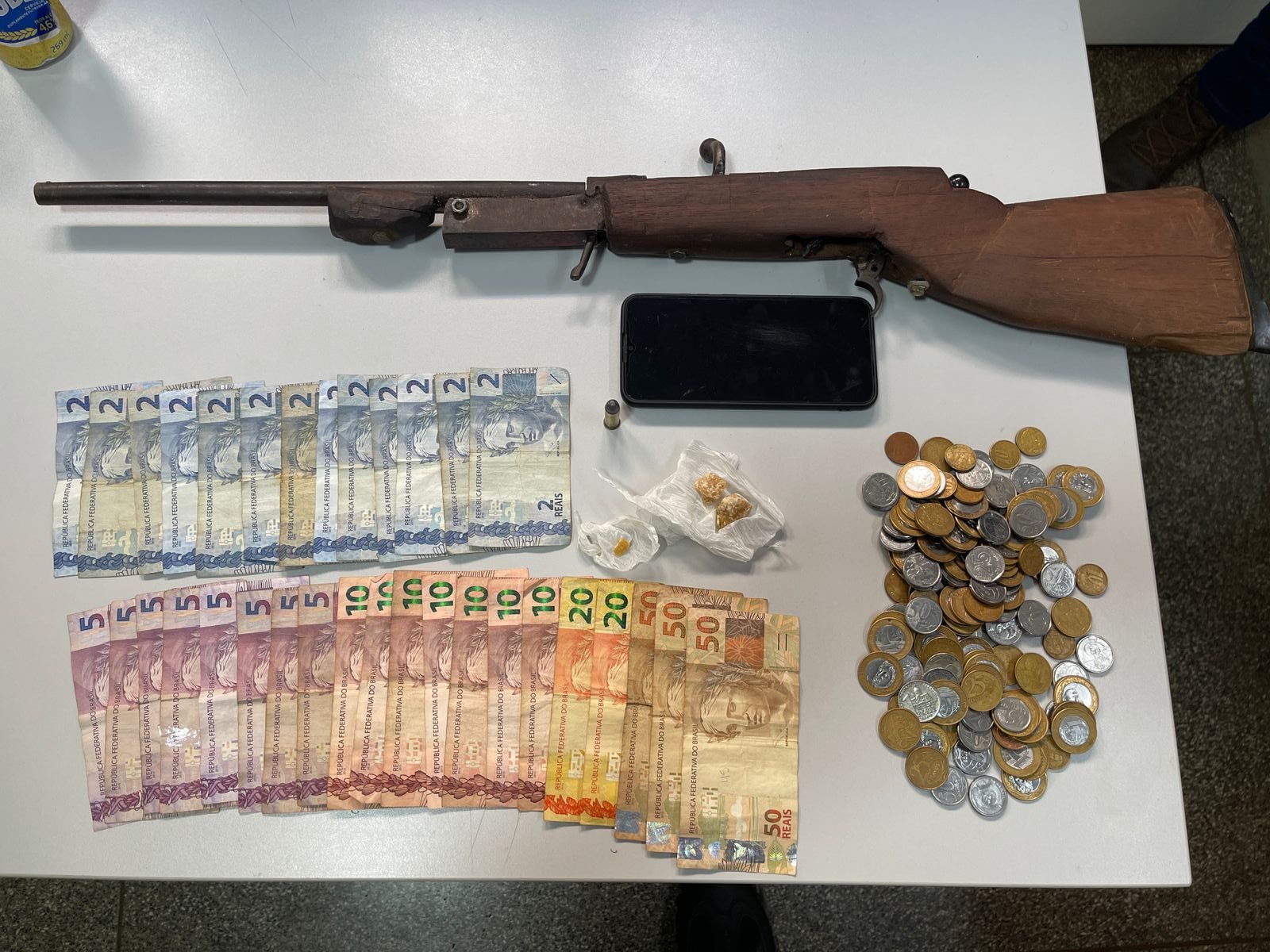 Durante a prisão em flagrante, foi localizada uma arma de fogo, calibre .38, uma munição, R$ 376,00 em cédulas trocadas e moedas, além de porções de crack já prontas para a venda, guardadas em uma fralda descartável de criança. O conduzido vai responder pelos crimes de tráfico de drogas e posse irregular de arma de fogo, permanecendo à disposição da justiça criminal.