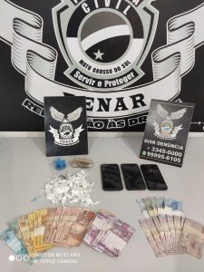 Diante disso, presentes as fundadas razões, principalmente por terem surpreendido dois usuários que acabaram de comprar a droga e configurada a situação flagrancial, os agentes policiais adentraram o imóvel e detiveram os três homens suspeitos de tráfico, obtendo sucesso na apreensão de três volumes de maconha, pesando 64 g, sendo uma fração de tablete, uma porção embalada em plástico transparente e uma porção embalada em plástico azul, e 43 trouxinhas de cocaína, pesando 24 g. Ainda, foram apreendidos três aparelhos celulares e a quantia de R$ 1.265,00 em dinheiro trocado.