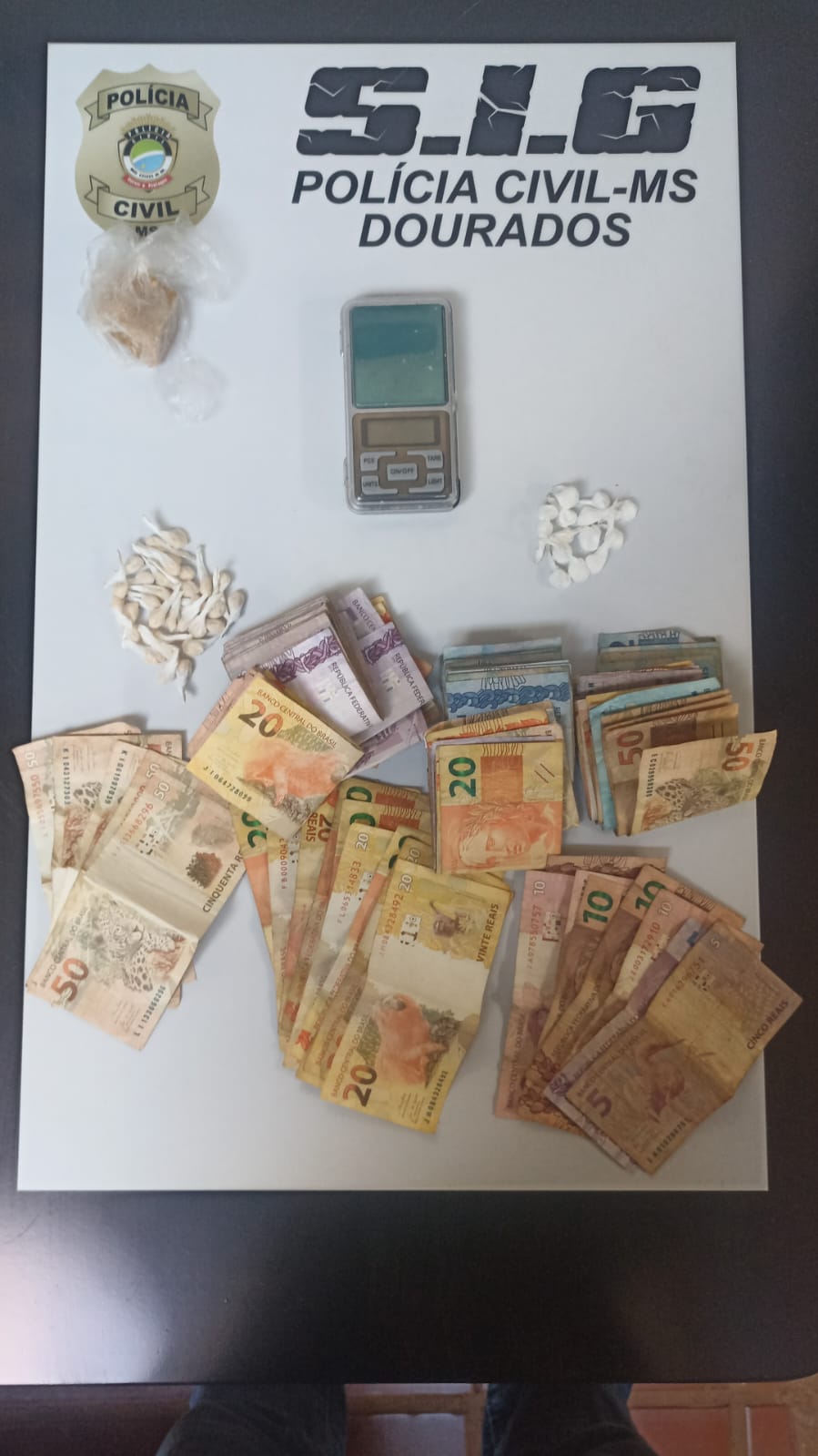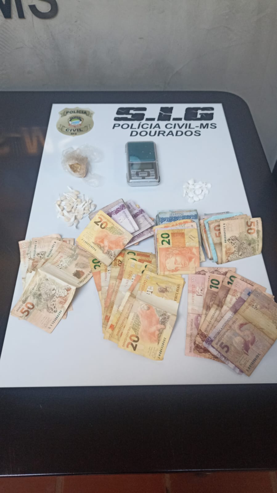 Na residência havia um veículo, onde foi encontrada uma balança de precisão e grande quantidade em moeda nacional em notas de diversos valores, indicando que se tratava de dinheiro auferido pelo tráfico.