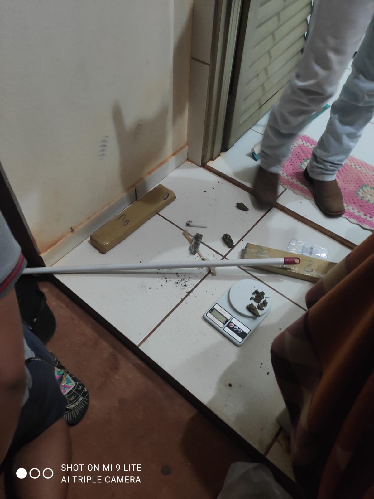 Na oportunidade, durante a busca, foram encontrados dois tijolos de maconha, devidamente embalados, no chão da cozinha, e também uma balança de precisão.