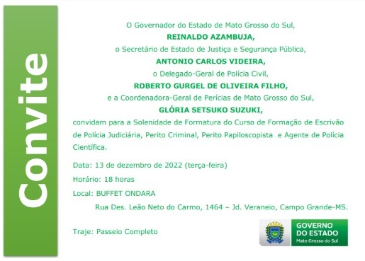Acontece nesta terça-feira, 13/12, a formatura do curso de formação dos policiais civis. A solenidade será realizada às 18 horas, em Campo Grande.